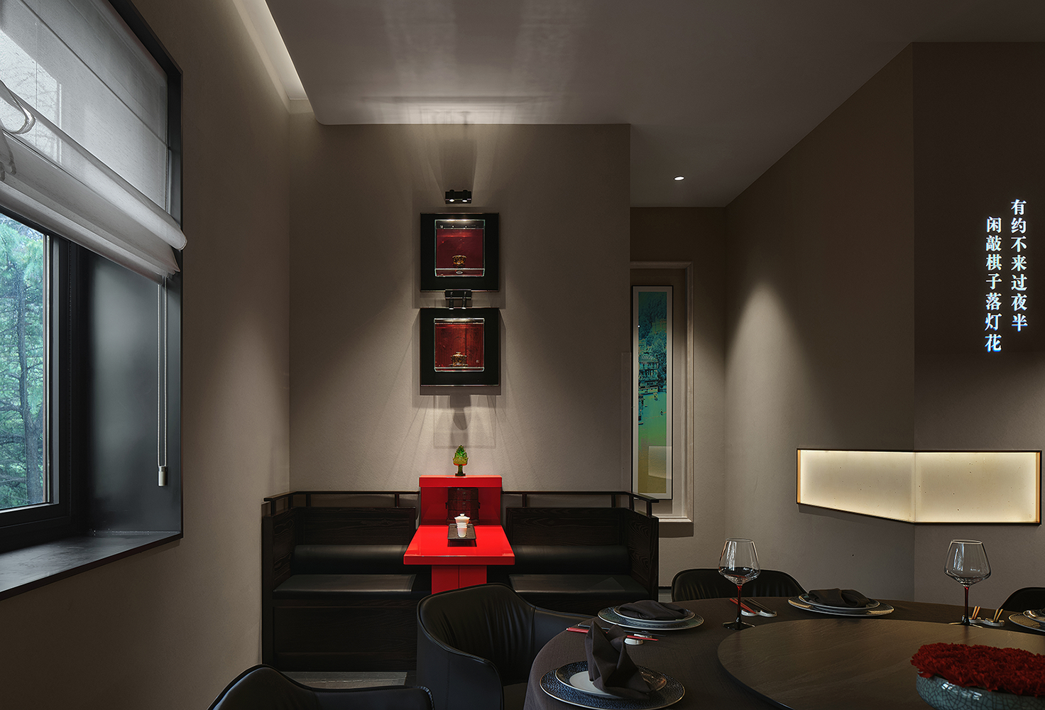 并由此区分出餐厅的内外空间关系,私密于开放的关系。