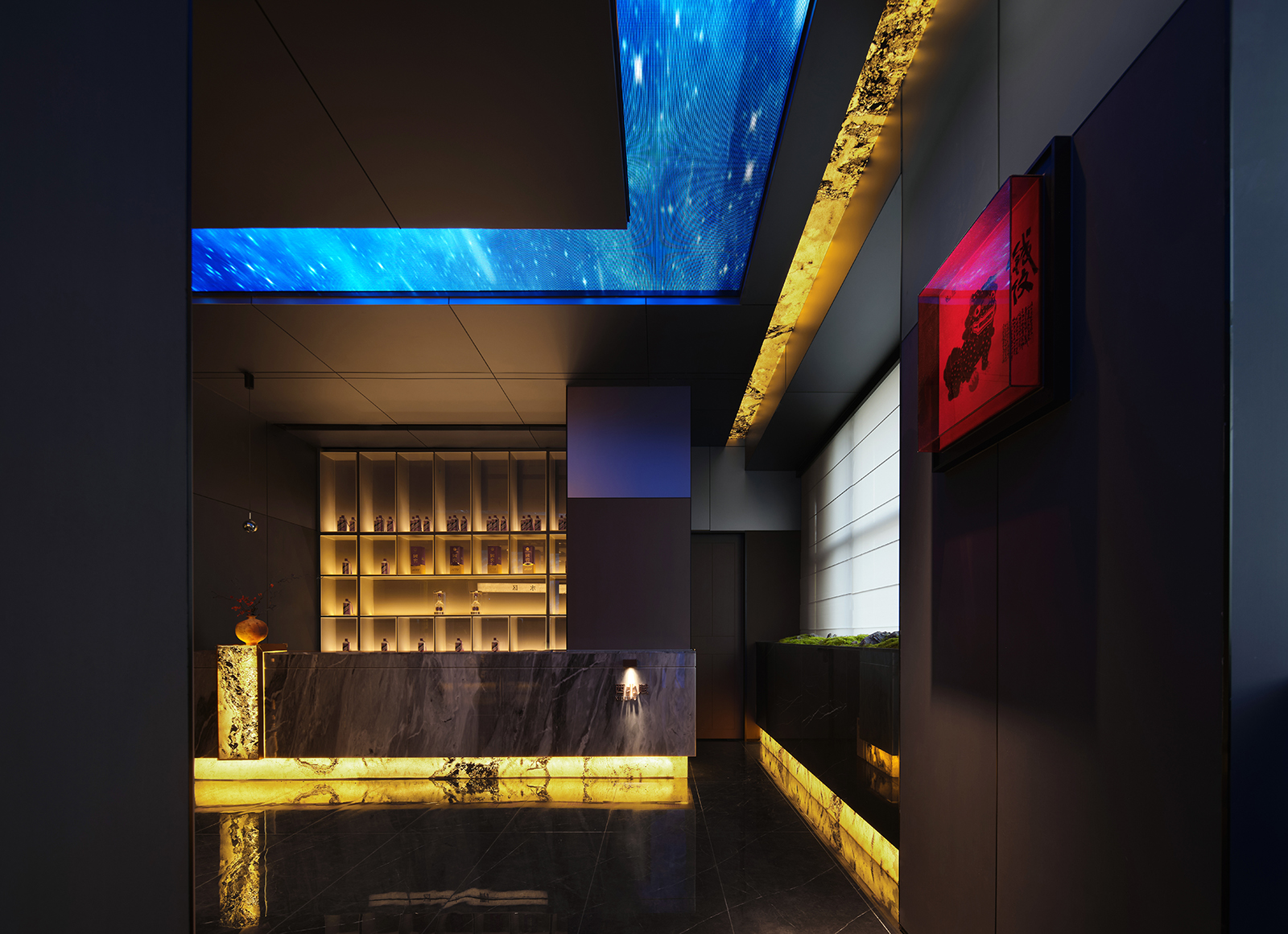 散厅零点区域由三道艺术屏风围合而成,