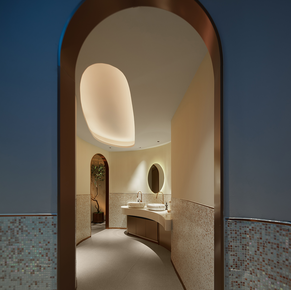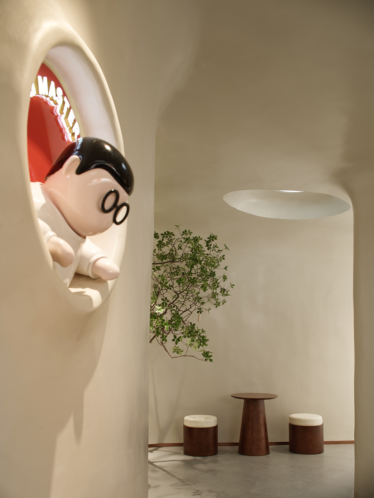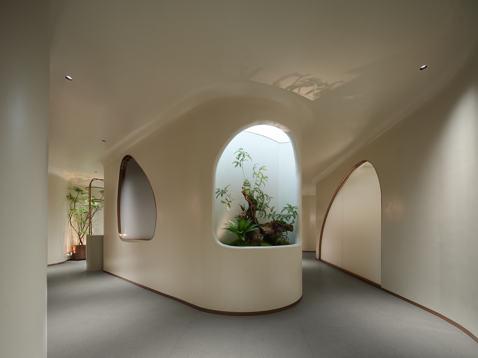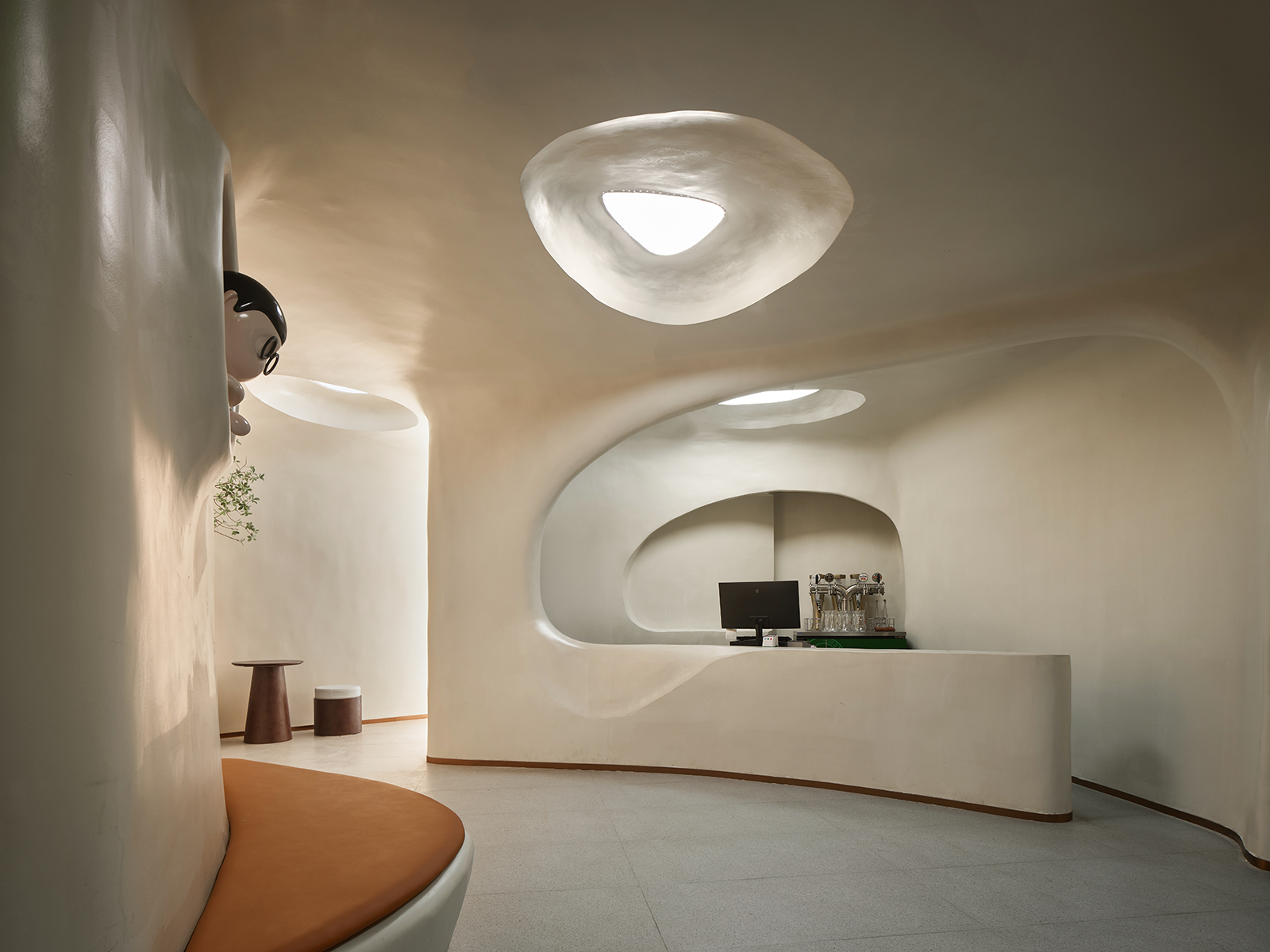 空间以高强水泥现场塑形曲面结构,搭配半哑光蛋壳艺术漆,