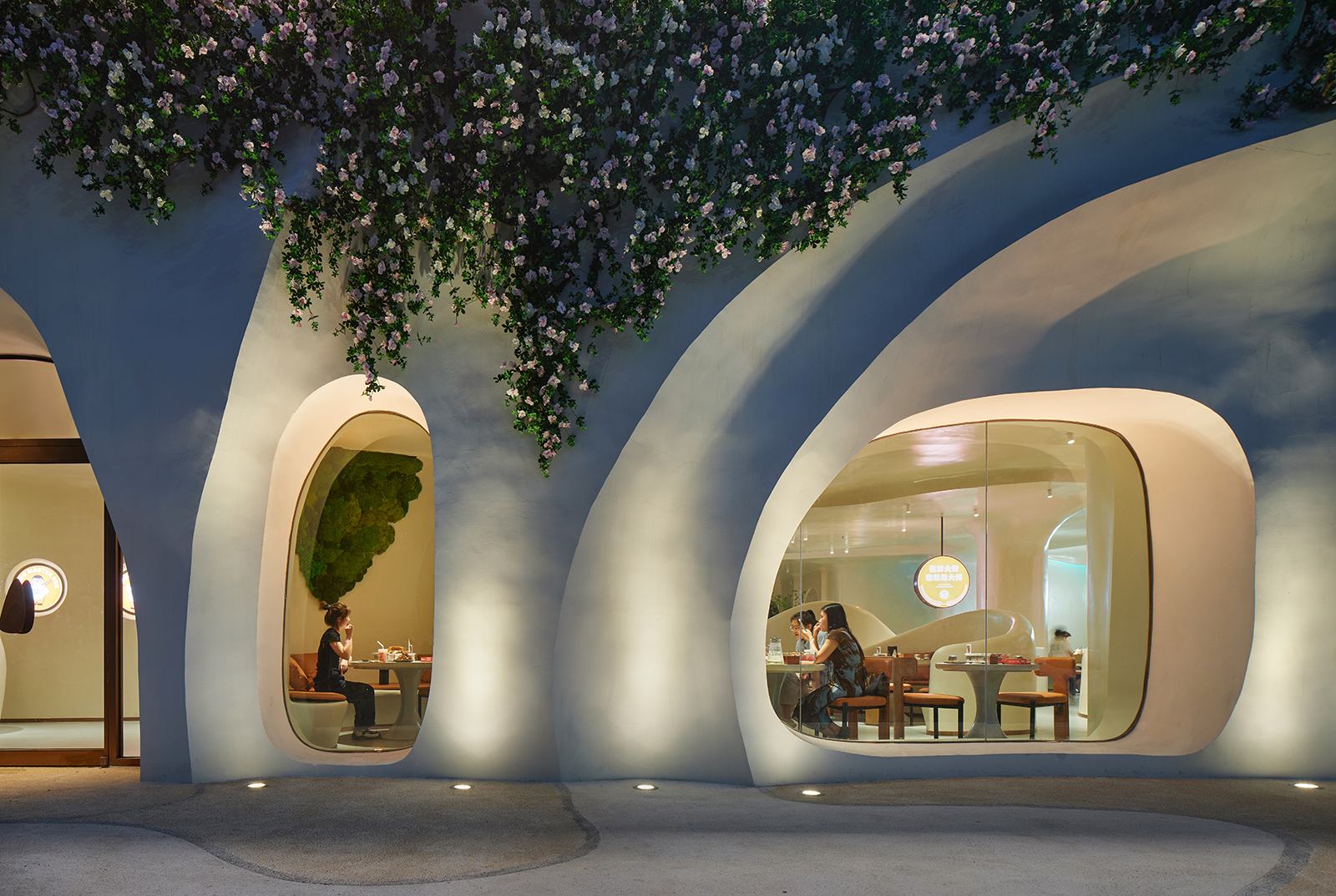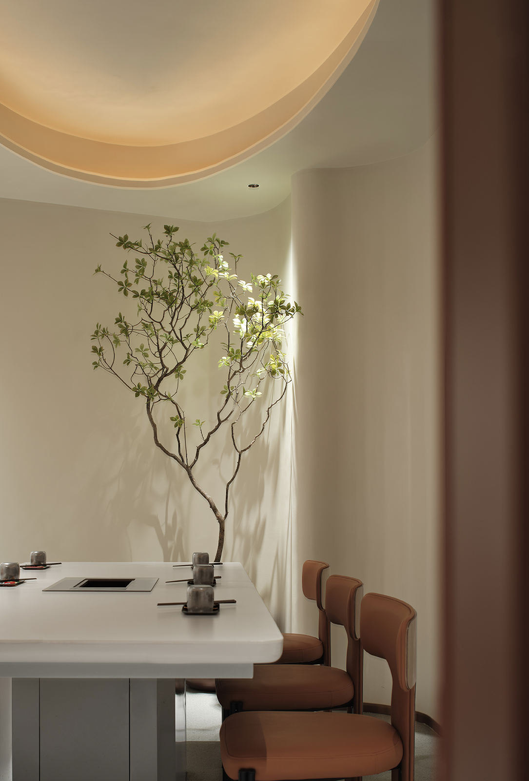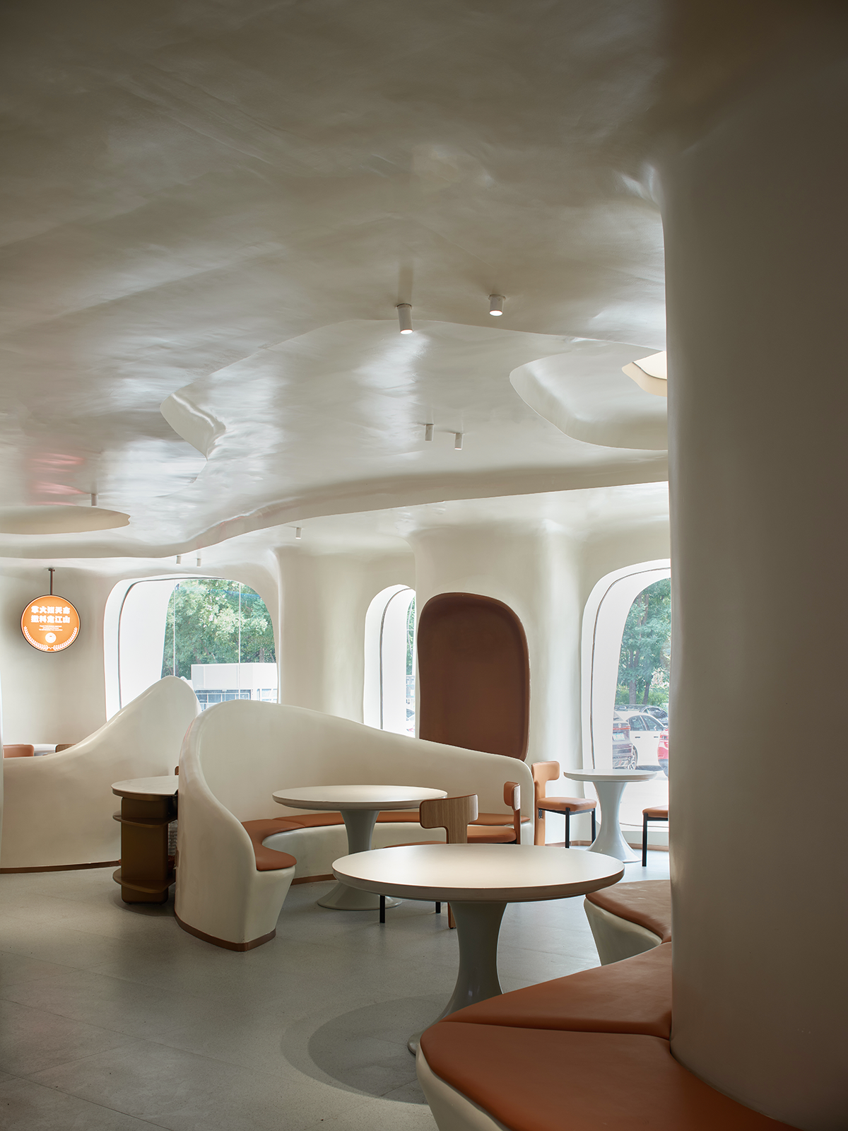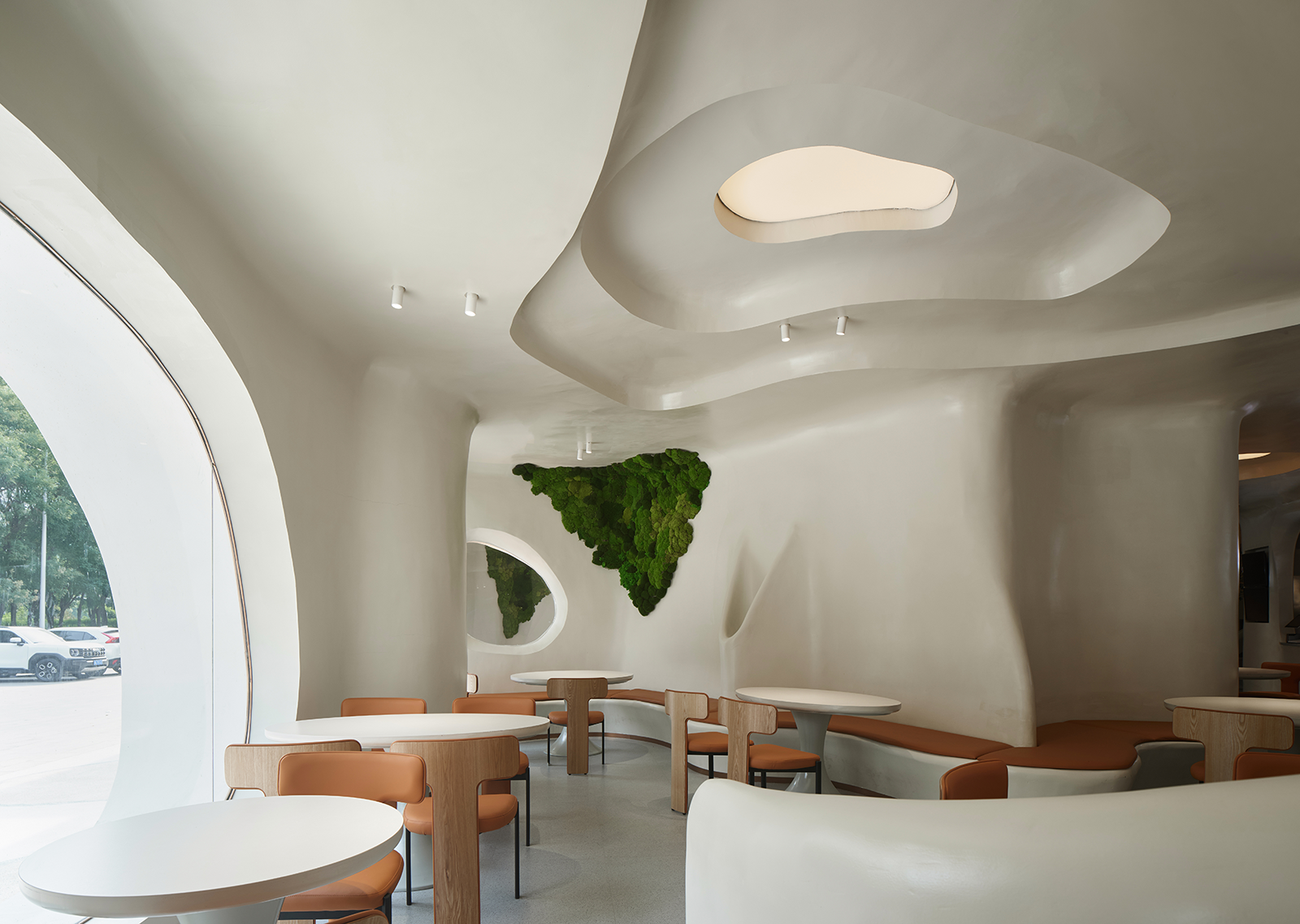 用餐区通过非线性曲面划分,兼顾私密性与通透感;